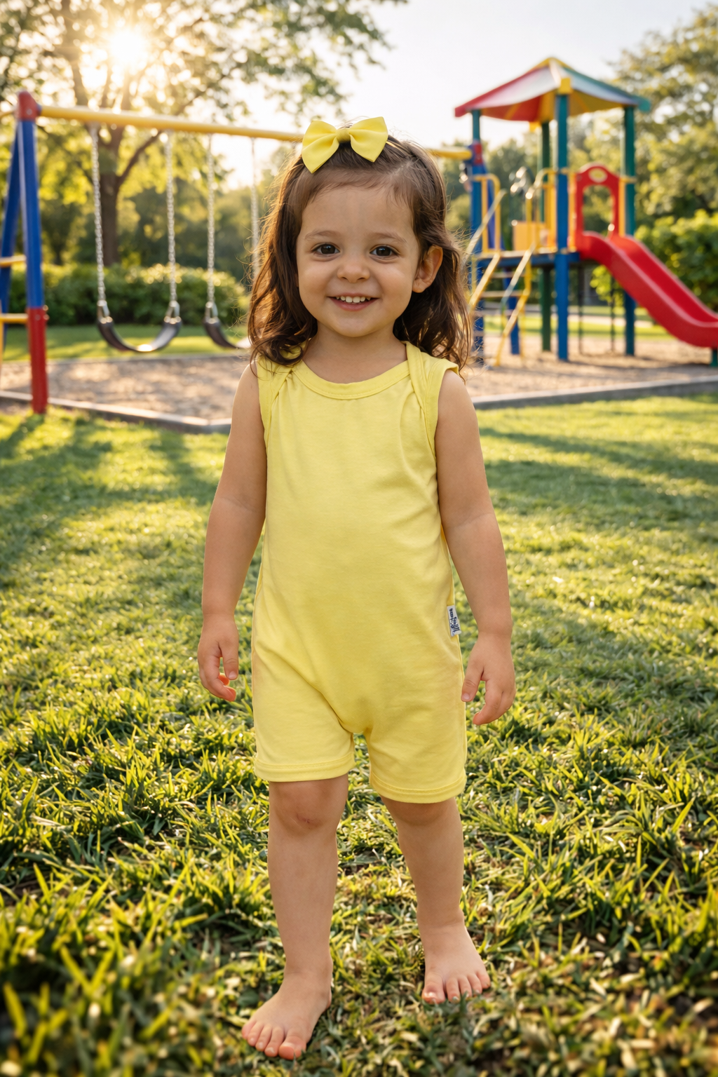 Feito com 93% viscose e 7% elastano, ele é fresco de verdade. Macio ao toque, não esquenta e acompanha cada movimento sem apertar. A viscose traz aquela sensação gostosa de tecido arejado, perfeita para os dias quentes. O elastano garante liberdade para o bebê rolar, engatinhar, brincar e dormir tranquilo.