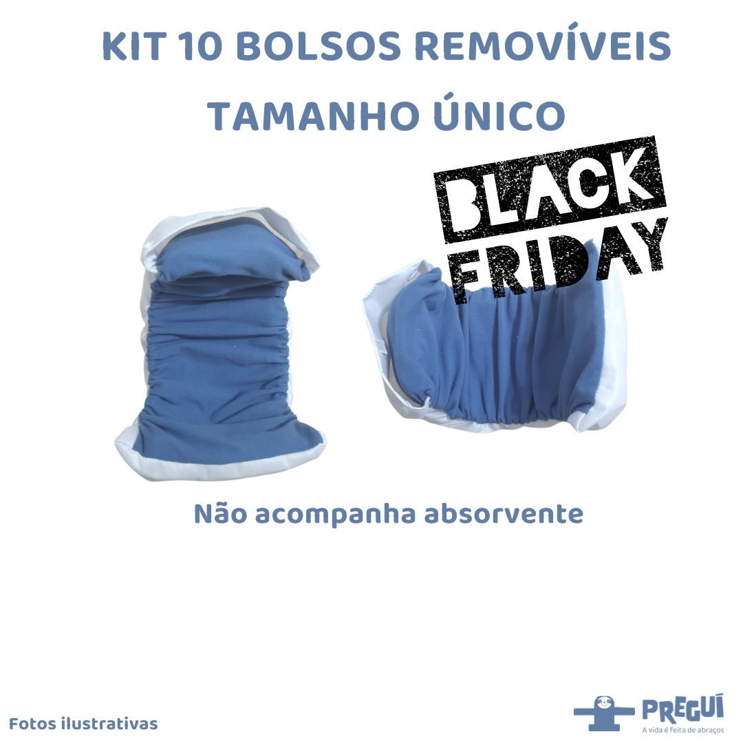 Kit com 10 bolsos removíveis feitos de tecido com toque seco e impermeável.